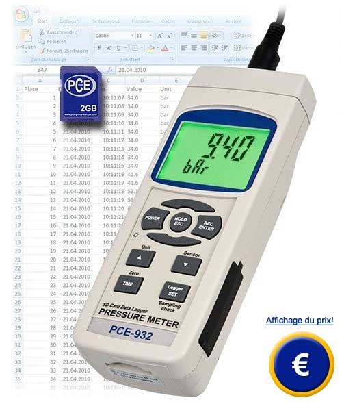 | Baromètre PCE-932 avec des capteurs externes pour des plages de mesure de jusqu'à 400 bar / carte de mémoire SD / interface RS-232 et logiciel optionnel pour le transfert de données en temps réel / sélection de plusieurs unités |