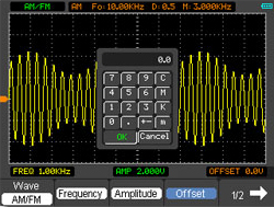 Le vaste menu de l'oscilloscope permet un réglage rapide et simple du générateur de fonctions. Avec un clavier numérique il est possible de régler directement tous les paramètres comme fréquence de sortie et tension de sortie. En utilisant l'oscilloscope comme générateur de fonctions il permet un travail rapide et surtout précis. Sur l'image ci-jointe vous pourrez observer le réglage de la fréquence et l'amplitude d'une forme d'onde de avec modulation FM, effectuée avec le clavier numérique comme décrit ci-dessus.